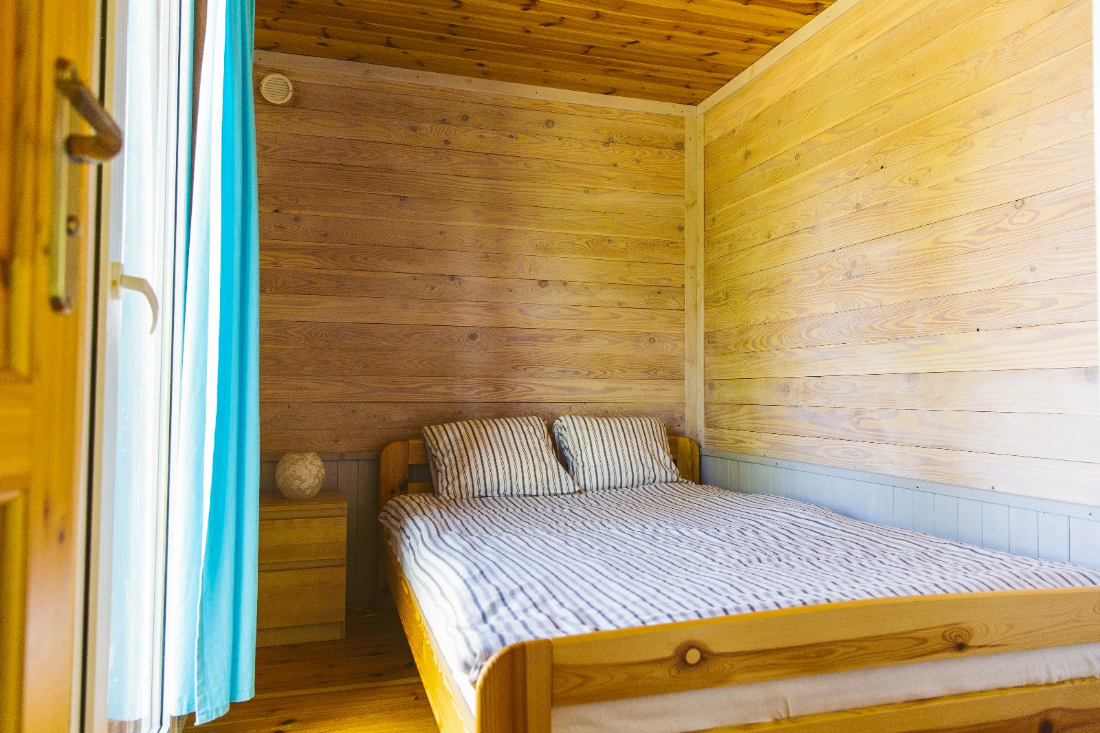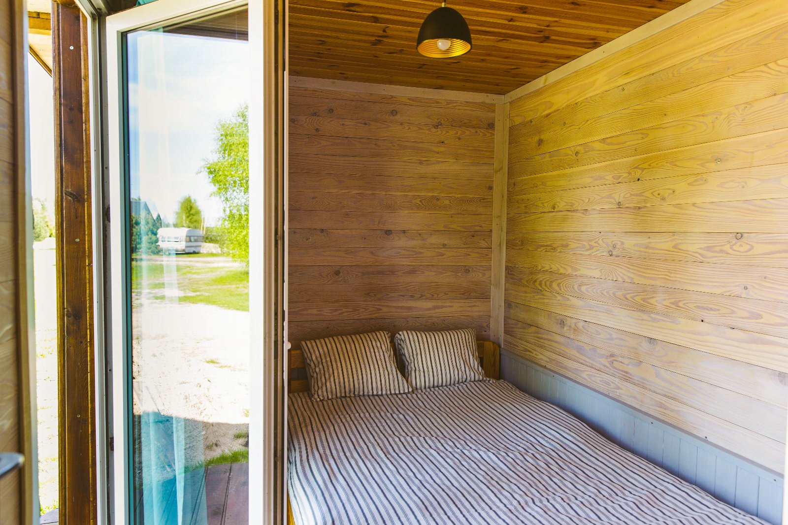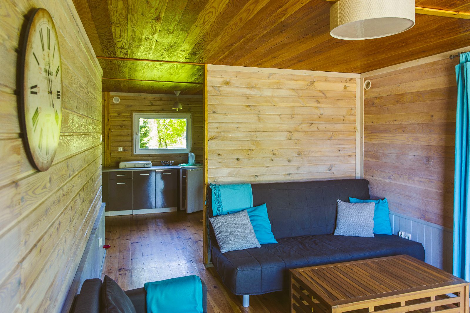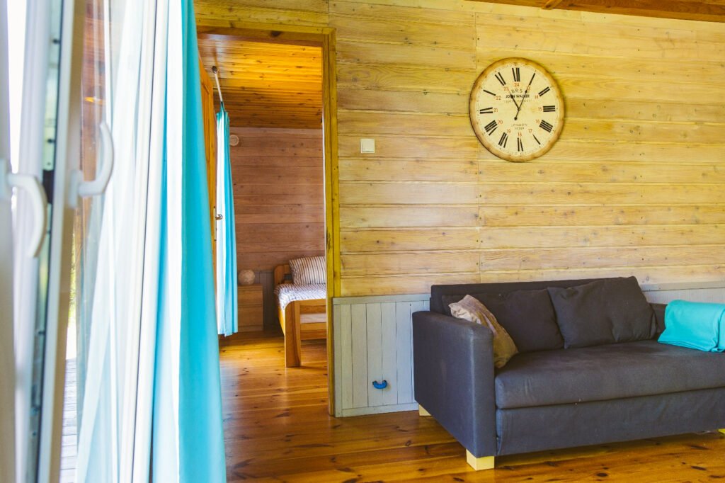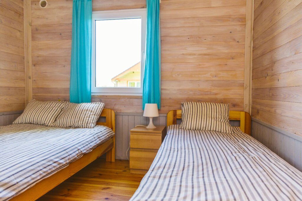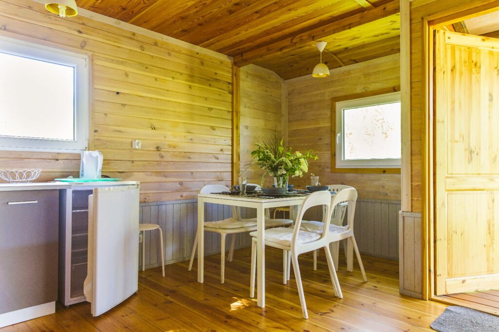 Domek C to wygodna przestrzeń z dwiema sypialniami oraz salonem połączonym z aneksem kuchennym. Układ jest prosty i funkcjonalny – każdy ma swoje miejsce do spania, a część dzienna sprawdza się przy wspólnych posiłkach i spokojnych wieczorach.