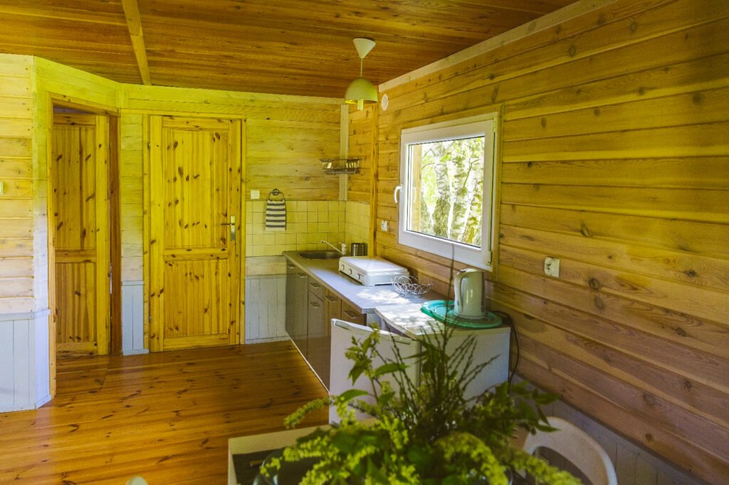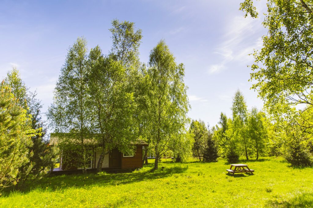 Drewniany domek wśród drzew, kilka minut od jeziora. Spokojne poranki, wieczory na tarasie i wakacje w stylu slow.