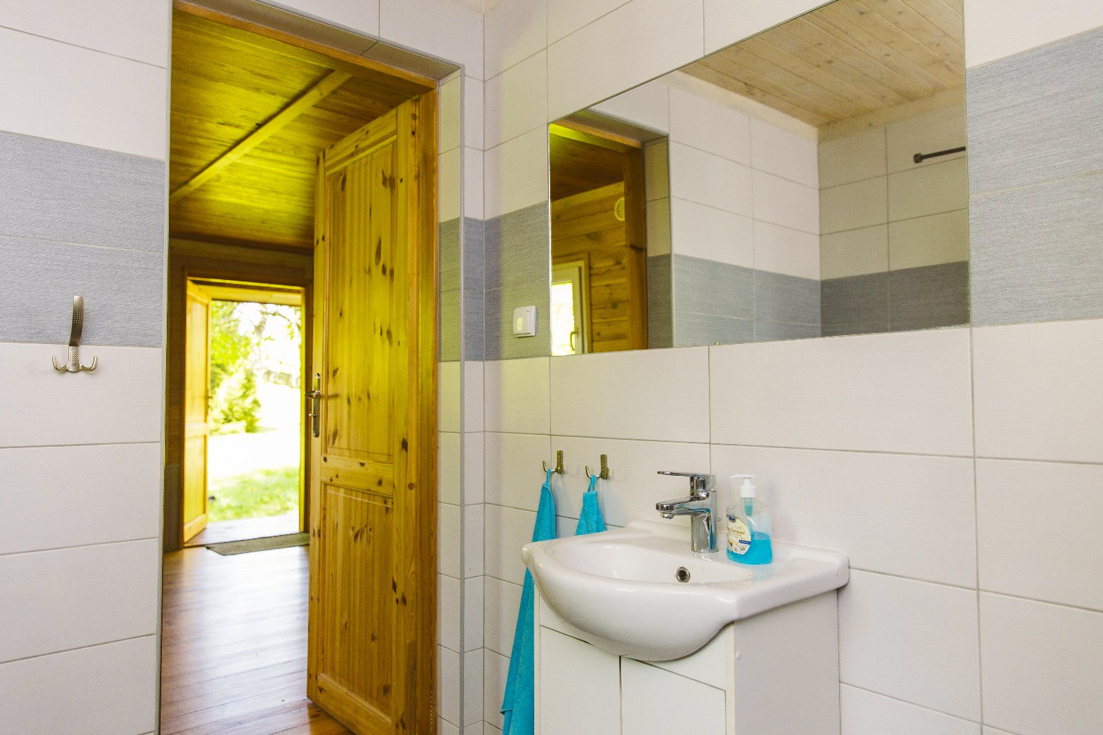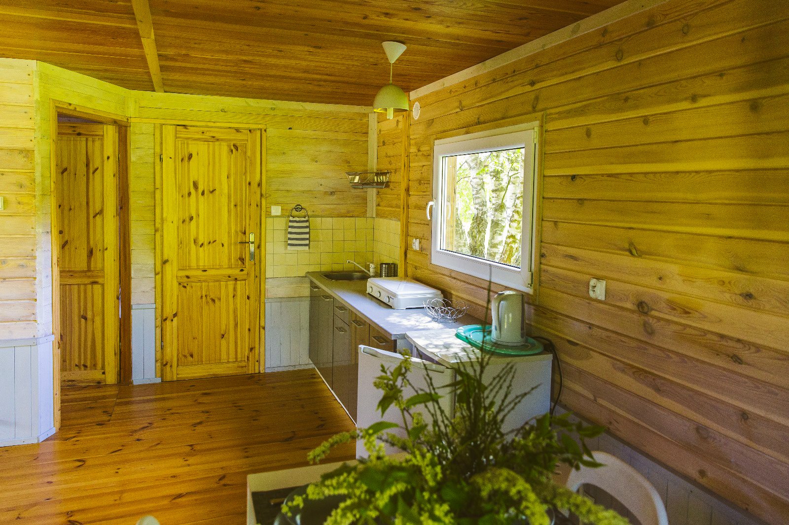 Przed domkiem jest miejsce, żeby usiąść na świeżym powietrzu i odpocząć po dniu nad jeziorem. Bliskość natury czuć tu na każdym kroku, a wszystko, co potrzebne na wakacyjny pobyt, masz pod ręką.